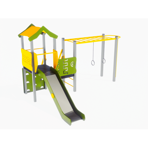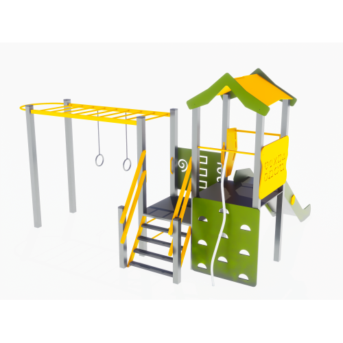 • Комплекс має ігрові елементи бізіборд та інтелектуальну стінку, також руколаз виготовлений з профільної труби 50х3082, труби Ду20*2,8 з підвисними металевими кільцями та з прикріпленим до нього пожежним спуском - труба Ду25*2,8.
