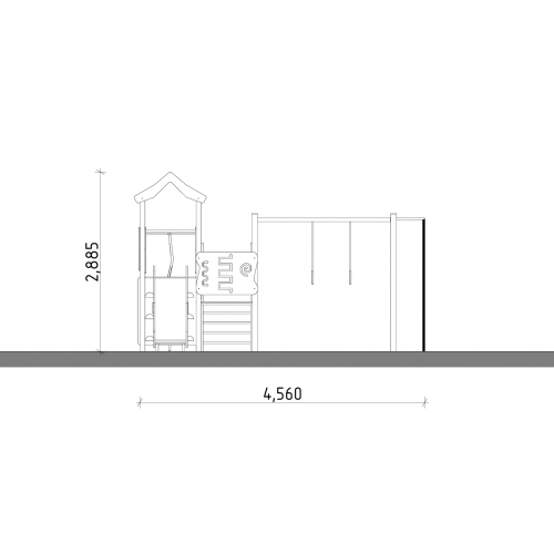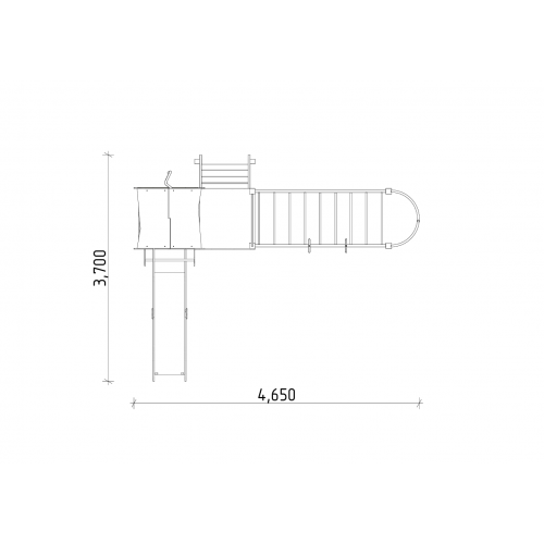 • Для комфортного підйому комплекс обладнаний східцями, каркас яких виготовленими з профільної труби 40х25*2, смуги 50х4 та сходинками з водостійкої фанери 15мм, поручнями з профільної труби 50х30*2, шведською стінкою з водостійкої фанери 15мм з підвисним канатом.