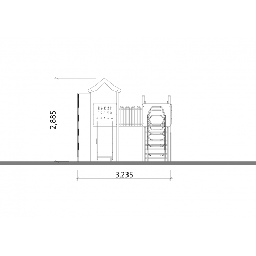 • Для комфортного підйому комплекс обладнаний східцями, каркас яких виготовленими з профільної труби 40х25*2, смуги 50х4 та сходинками з водостійкої фанери С/ГЛ 15мм, поручнями з профільної труби 50х30*2 та лаз трубою виконаною з труби Ду25*2,8 та Ду15*2,8, лазилкою у вигліді змійки - труба Ду25*2,8, Ду15*2,8.