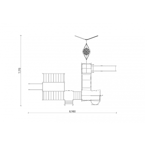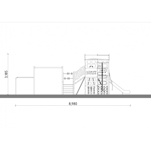• Комплекс має металеві перила виготовлені з труби 50х30*2 та перила з водостійкої фанери 15 мм, обмежувальні трубки з труби Ду20*2,8, підвісний місток на армованих канатах 16 мм, ігрові елементи "інтелектуальна стінка", "хрестики-нулики", "слова", "цифри".