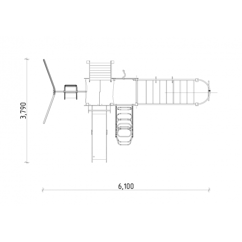 • Для комфортного підйому комплекс обладнаний східцями, каркас яких виготовлений з профільної труби 40х25*2, смуги 50х4 та сходинками з водостійкої фанери С/ГЛ 15мм, поручнями з профільної труби 50х30*2 та фанерною шведською стінкою з підвисним канатом та лаз трубою.