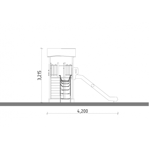 • Для комфортного підйому комплекс обладнаний східцями, каркас яких виготовленими з профільної труби 40х25*2, смуги 50х4 та сходинками з ламінованої водостійкої фанери С/ГЛ 15мм, поручнями з профільної труби 50х30*2, лазилкою звичайною виконаною з труби Ду25*2,8, Ду15*2,8